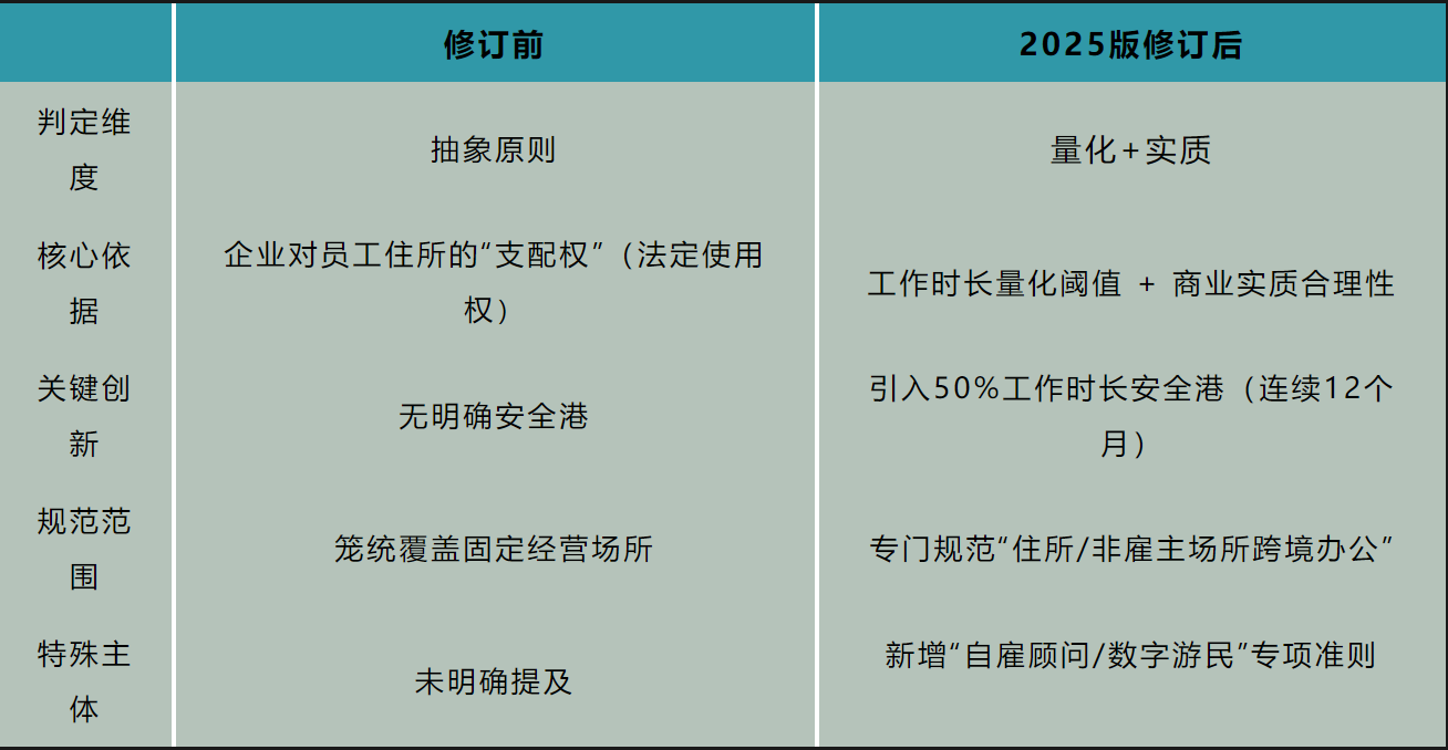 这是本次修订最关键的创新。根据2025版注释,在任何连续12个月内,若员工为企业在“非雇主所有场所”工作的时长,未达到其同期总工作时长的50%,则该场所通常不构成企业的经营场所。该阈值为跨国企业提供了明确的合规边界,无需再纠结于“是否提供办公设备”“是否报销租金”等形式化支配权问题。